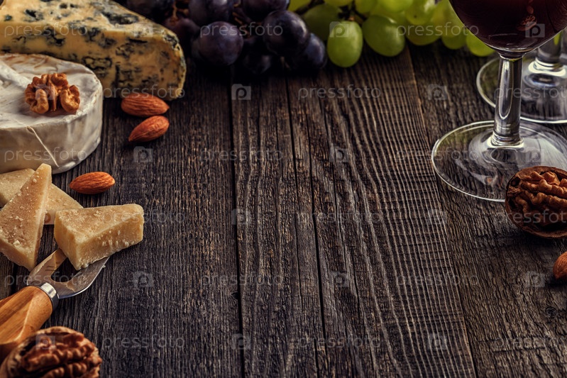 Сыр, орехи, виноград и красное вино на деревянном фоне