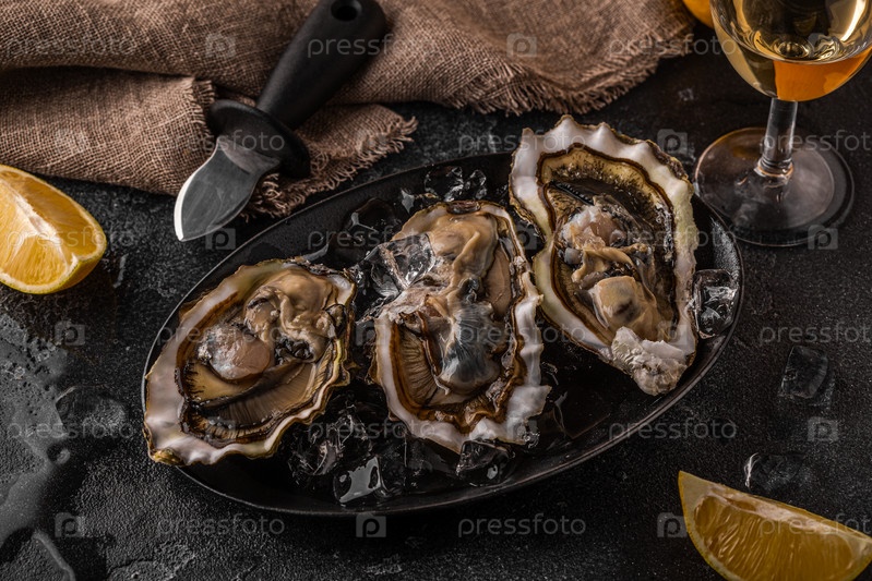 Свежие устрицы крупным планом на льду, подаются с лимоном и вином