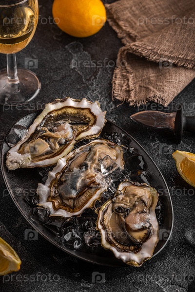 Свежие устрицы крупным планом на льду, подаются с лимоном и вином