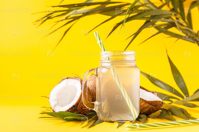 Кокосовая вода и кокосы на ярком пастельном фоне