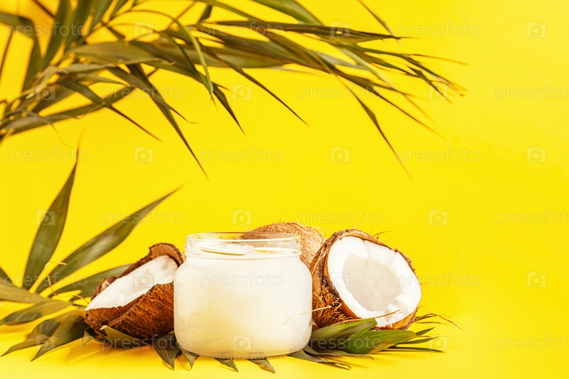 Кокосовое масло и кокосы на ярком пастельном фоне