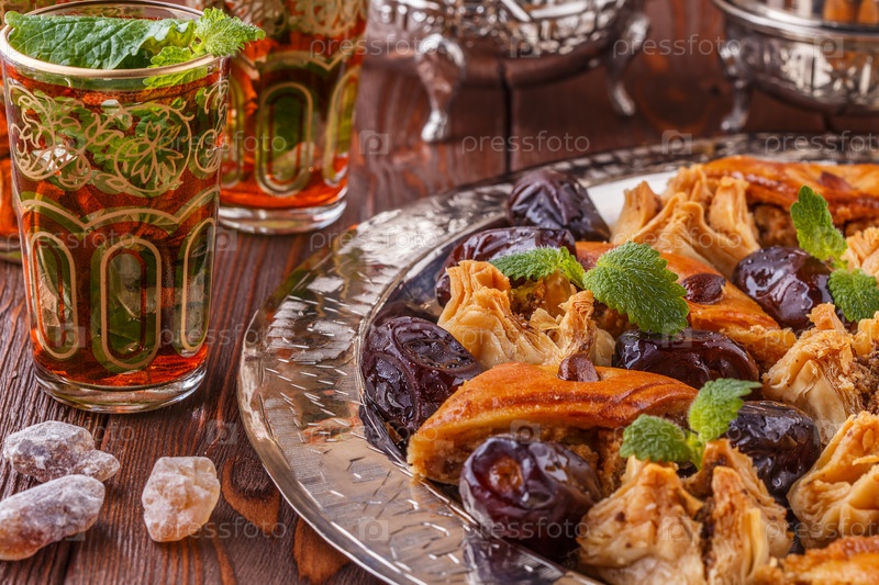 Марокканский мятный чай в традиционных стаканах со сладостями