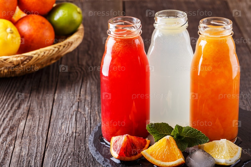 Свежие цитрусовые соки на темном деревянном фоне