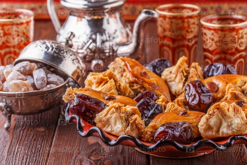 Марокканский мятный чай в традиционных стаканах со сладостями