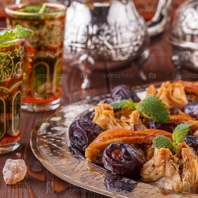 Марокканский мятный чай в традиционных стаканах со сладостями