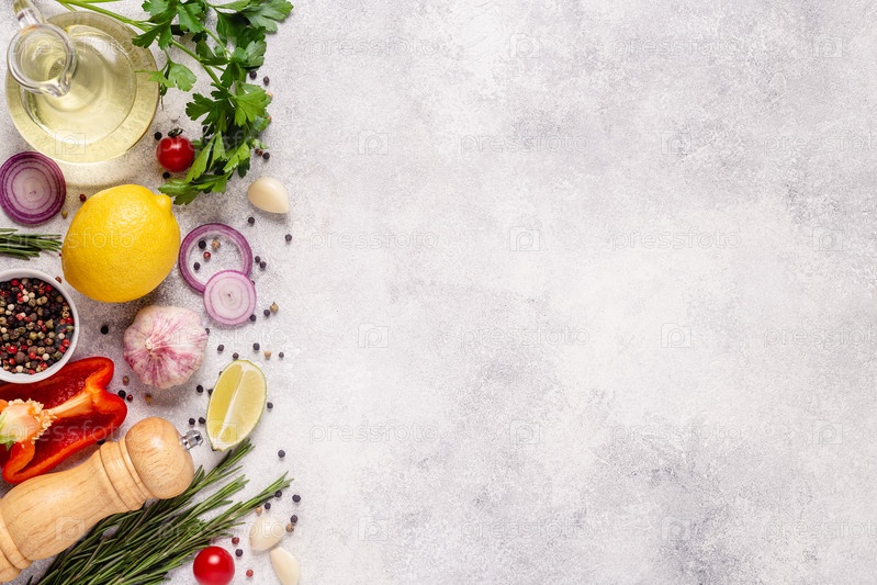 Травы и приправы на светлом каменном фоне