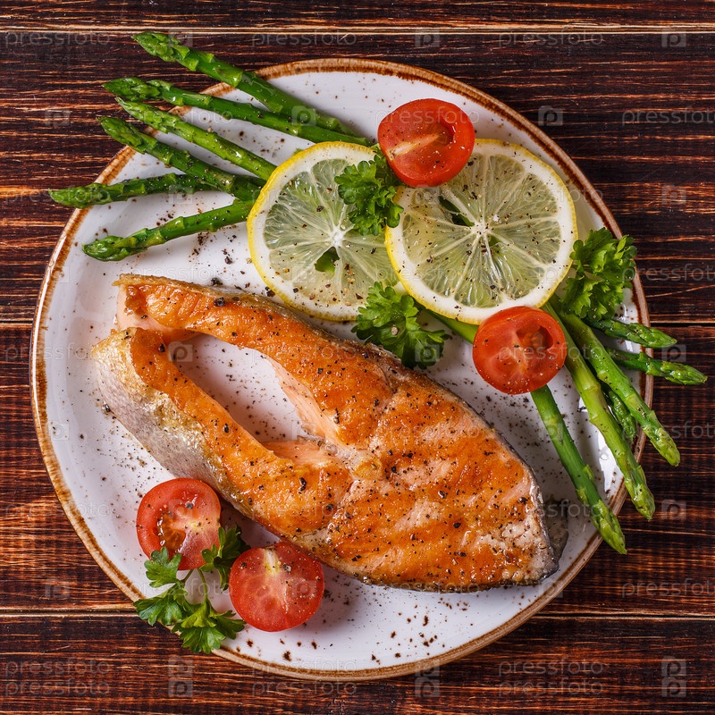 Стейк из лосося на гриле, подается со спаржей, помидорами и лимоном