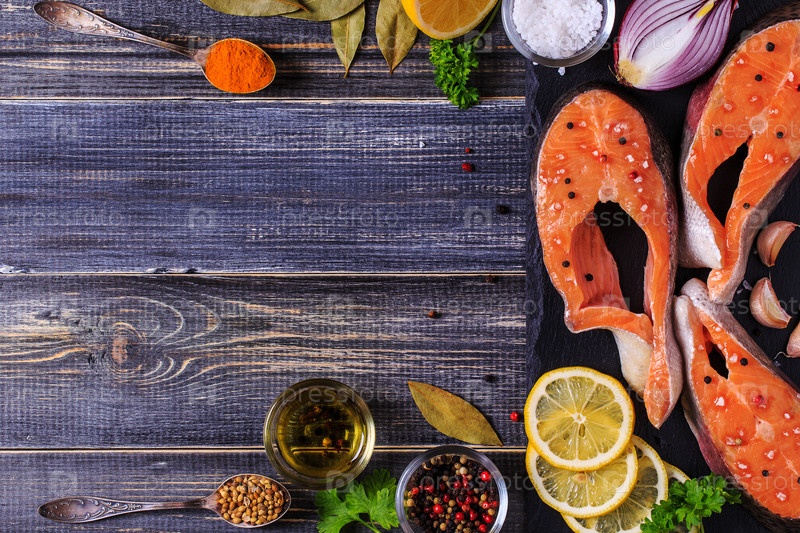 Свежие сырые стейки из лосося с ингредиентами