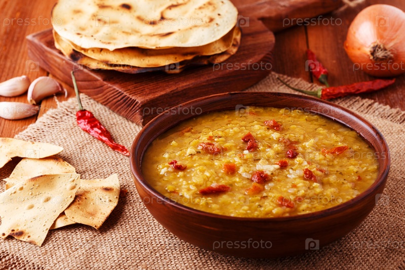 Густой индийский суп из красной чечевицы с кинзой, подается с индийскими лепешками
