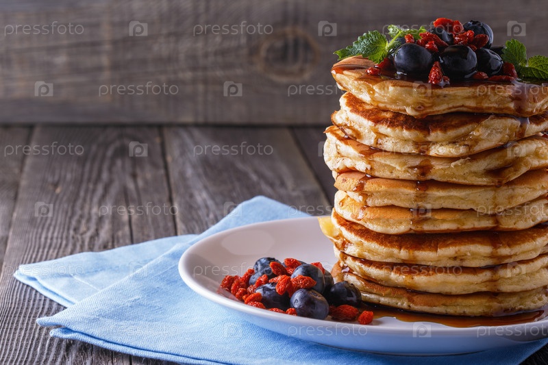 Стопка блинчиков со свежей черникой, годжи и кленовым сиропом