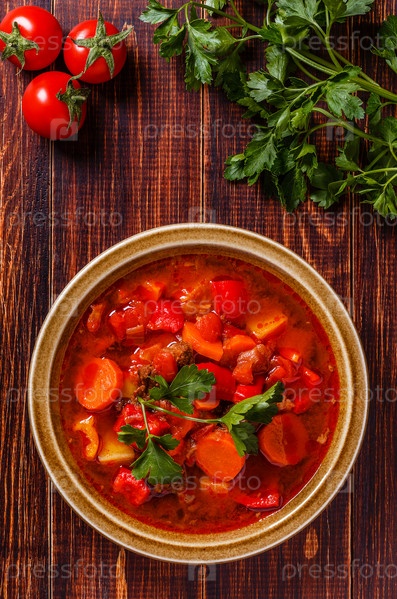 Гуляш или тушеное мясо в миске с петрушкой на деревянном фоне
