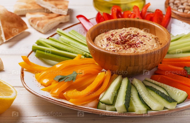 Домашний хумус с ассорти из свежих овощей и лавашом