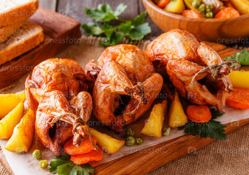Жареный перепел с овощами на сервировочной доске
