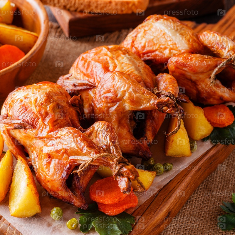 Жареный перепел с овощами на сервировочной доске