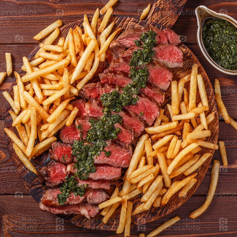 Стейк рибай барбекю из говядины с соусом чимичурри и картофелем фри