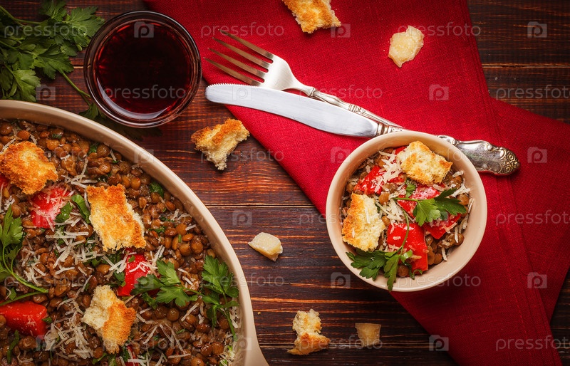 Чечевица тушеная с беконом, перцем и гренками
