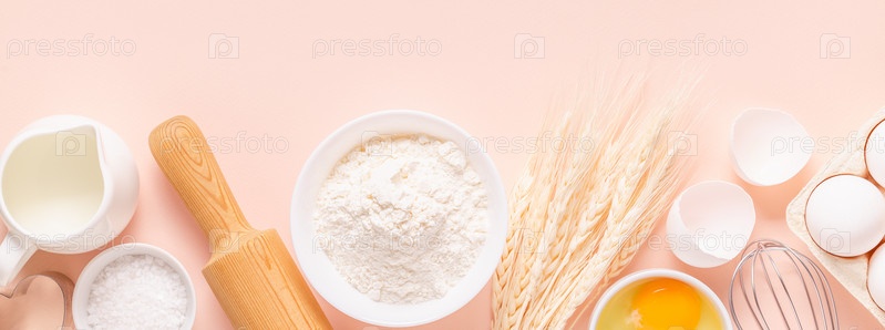 Ингредиенты для выпечки на светло-розовом фоне