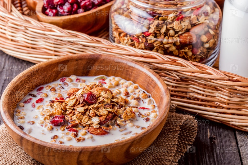 Домашняя гранола с молоком, ягодами, семечками и орехами
