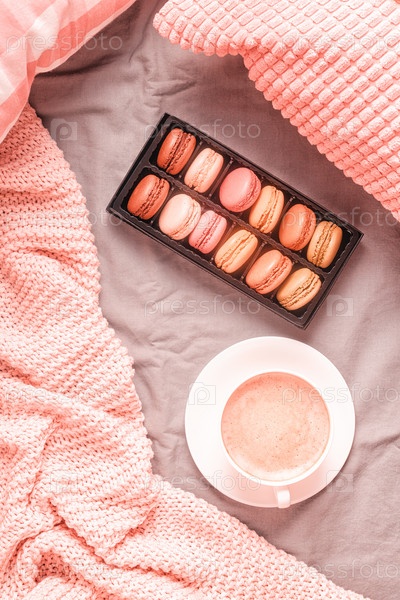 Кровать с розовым вязаным пледом, кофе и миндальным печеньем