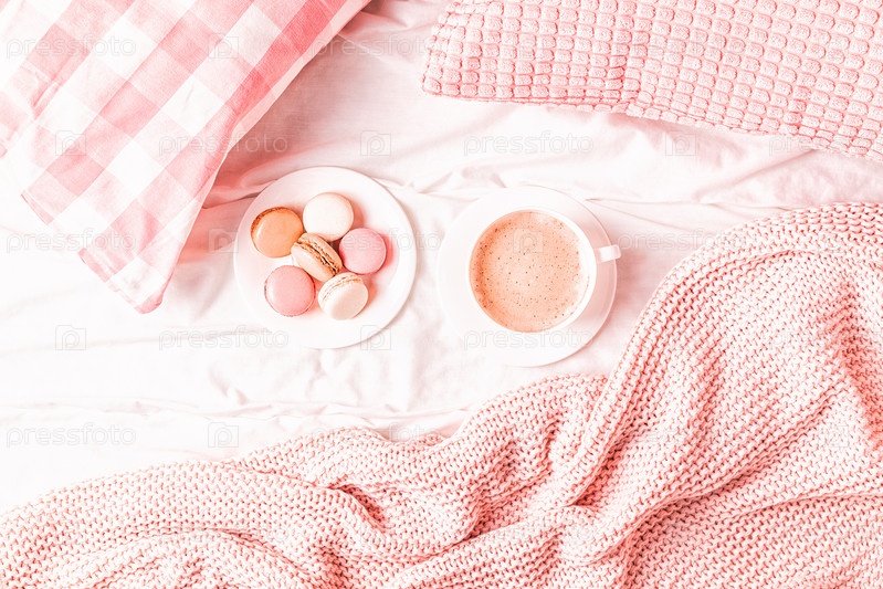 Кровать с розовым вязаным пледом, кофе и миндальным печеньем