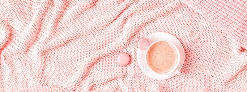 Фон с розовым пледом, кофе и миндальным печеньем