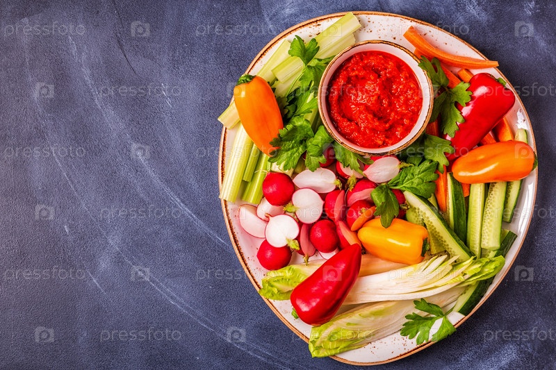 Тарелка со свежими, сырыми овощами и соусом
