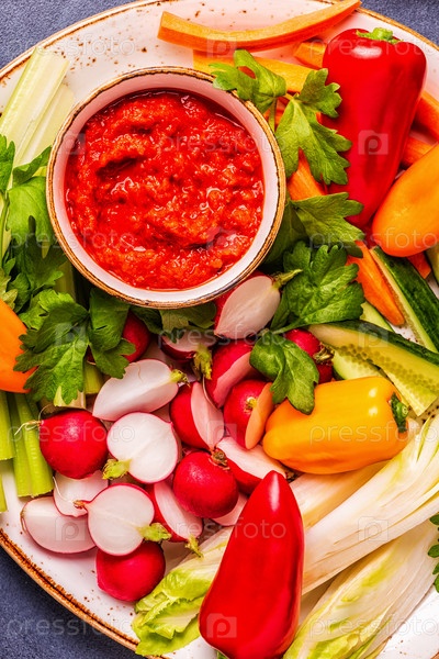 Тарелка со свежими, сырыми овощами и соусом
