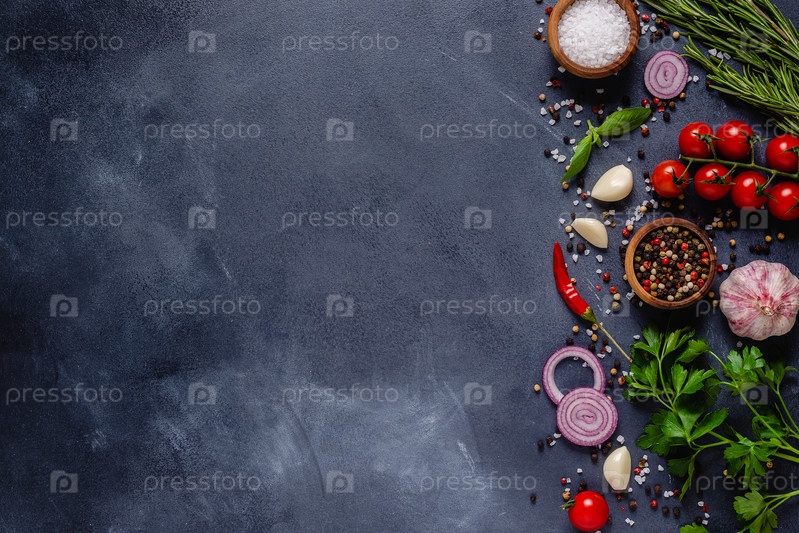Травы и приправы на фоне черного камня