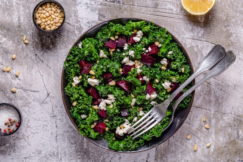 Здоровый салат из сырой капусты и свеклы с сыром фета и кедровым орехом