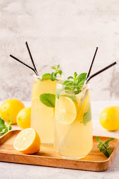 Лимонад с лимоном, мятой и кубиками льда в стакане