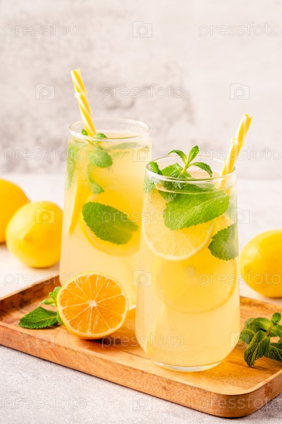 Лимонад с лимоном, мятой и кубиками льда в стакане