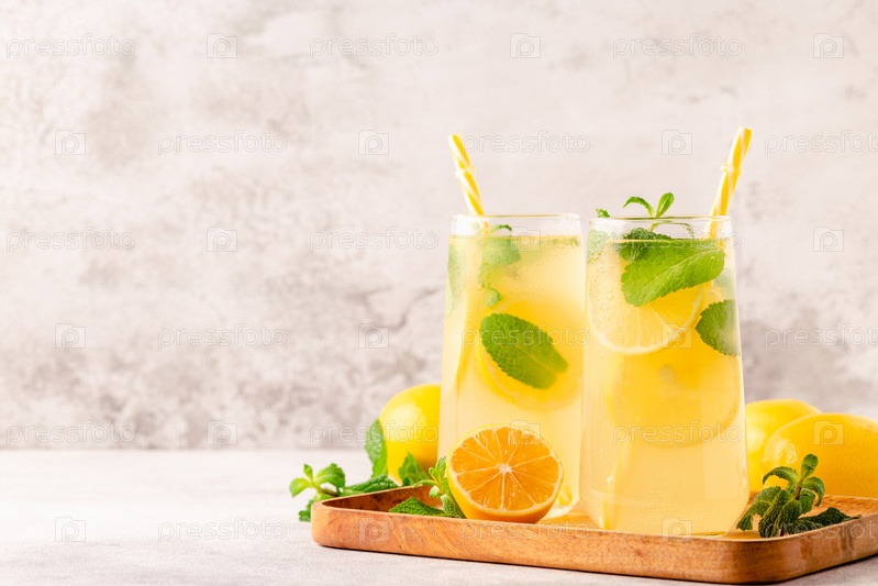 Лимонад с лимоном, мятой и кубиками льда в стакане