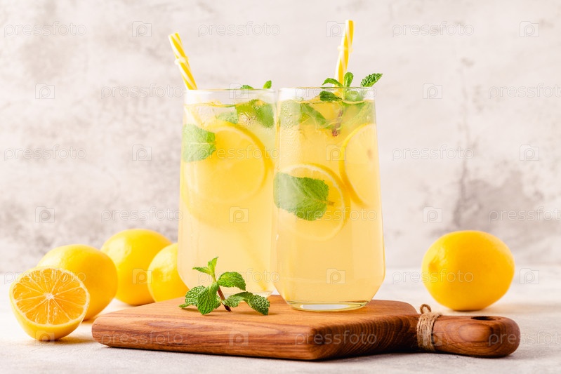 Лимонад с лимоном, мятой и кубиками льда в стакане