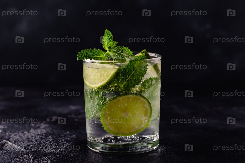 Освежающий летний алкогольный коктейль мохито со льдом, свежей мятой и лаймом