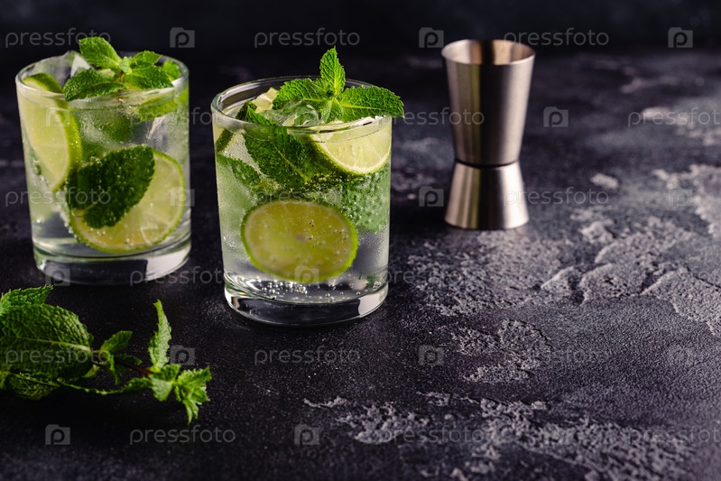 Освежающий летний алкогольный коктейль мохито со льдом, свежей мятой и лаймом