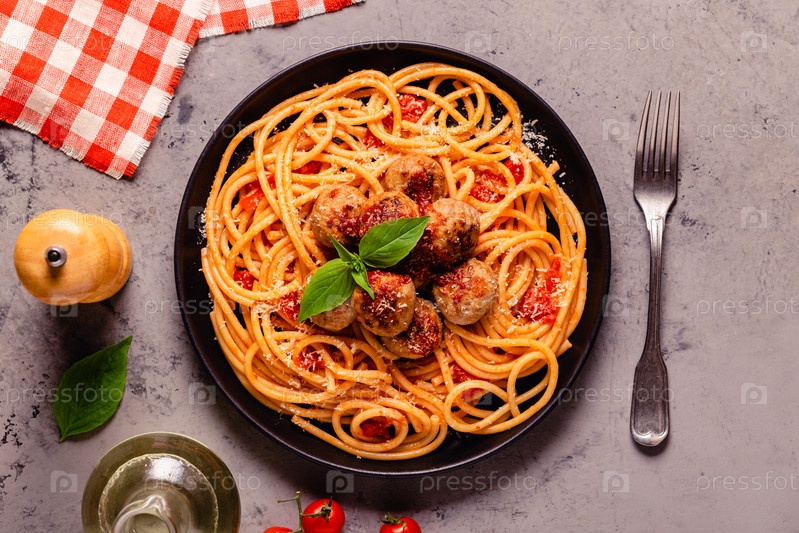 Спагетти с фрикадельками и томатным соусом на каменном фоне