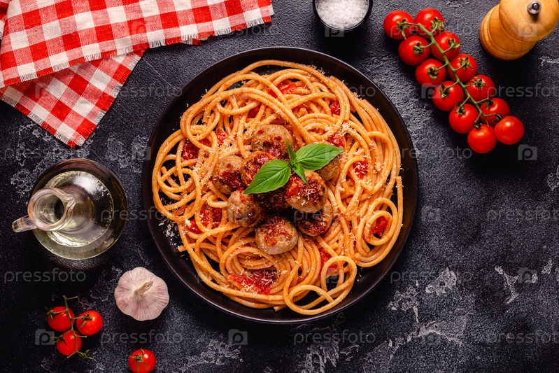 Спагетти с фрикадельками и томатным соусом на каменном фоне