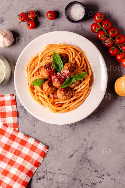 Спагетти с фрикадельками и томатным соусом на каменном фоне