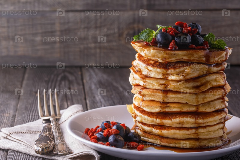 Стопка блинчиков со свежей черникой, годжи и кленовым сиропом