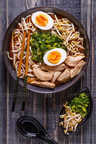 Японский суп рамен с курицей, яйцом, зеленым луком и ростками