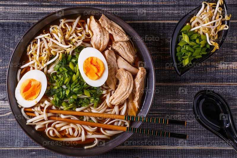 Японский суп рамен с курицей, яйцом, зеленым луком и ростками