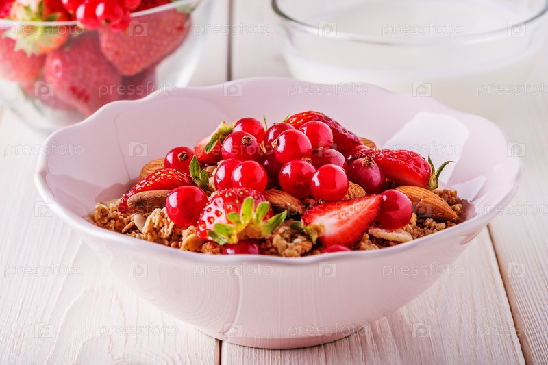 Здоровый завтрак - чаша мюсли овса со свежими фруктами, миндалем и белым шоколадом