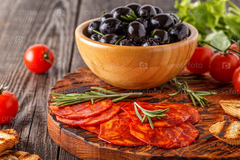 Испанская традиционная колбаса чоризо со свежей зеленью, оливками, помидорами