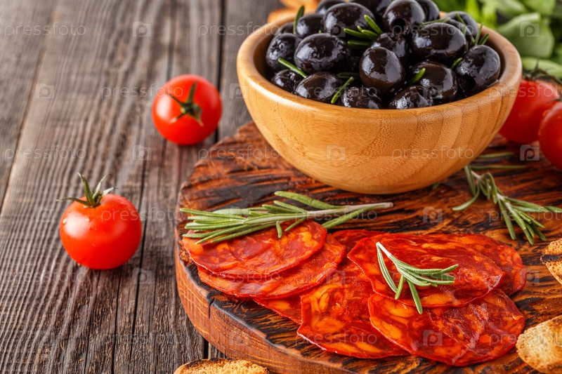 Испанская традиционная колбаса чоризо со свежей зеленью, оливками, помидорами