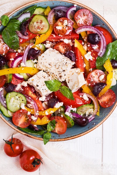 Греческий салат со свежими овощами, сыром фета, маслинами
