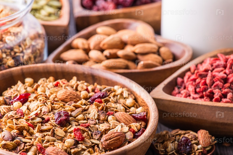 Домашняя гранола с молоком, ягодами, семечками и орехами