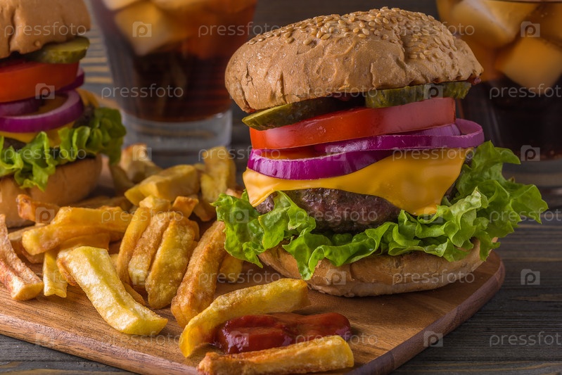 Бургер, гамбургер с картофелем фри и свежими овощами