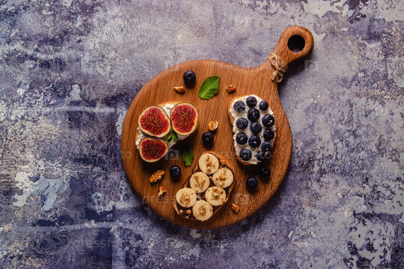 Домашний летний тост со сливочным сыром, ореховым маслом и фруктами и ягодами