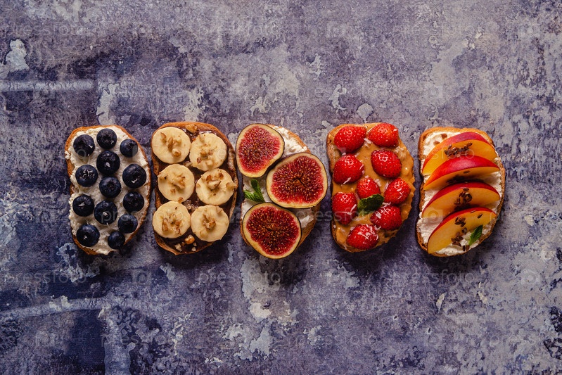 Домашний летний тост со сливочным сыром, ореховым маслом и фруктами и ягодами