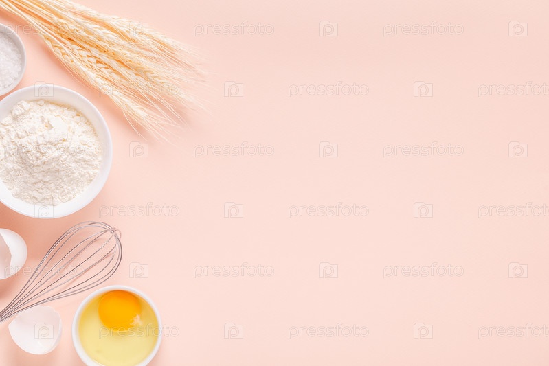 Ингредиенты для выпечки на светло-розовом фоне